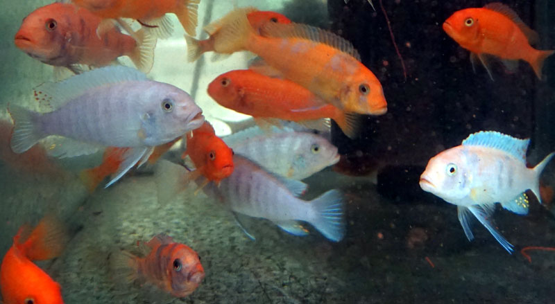 This aquarium strain albino starts out life as red with blue blotches and the males turn white with pink bars when old and the females keep the juvenile colors.